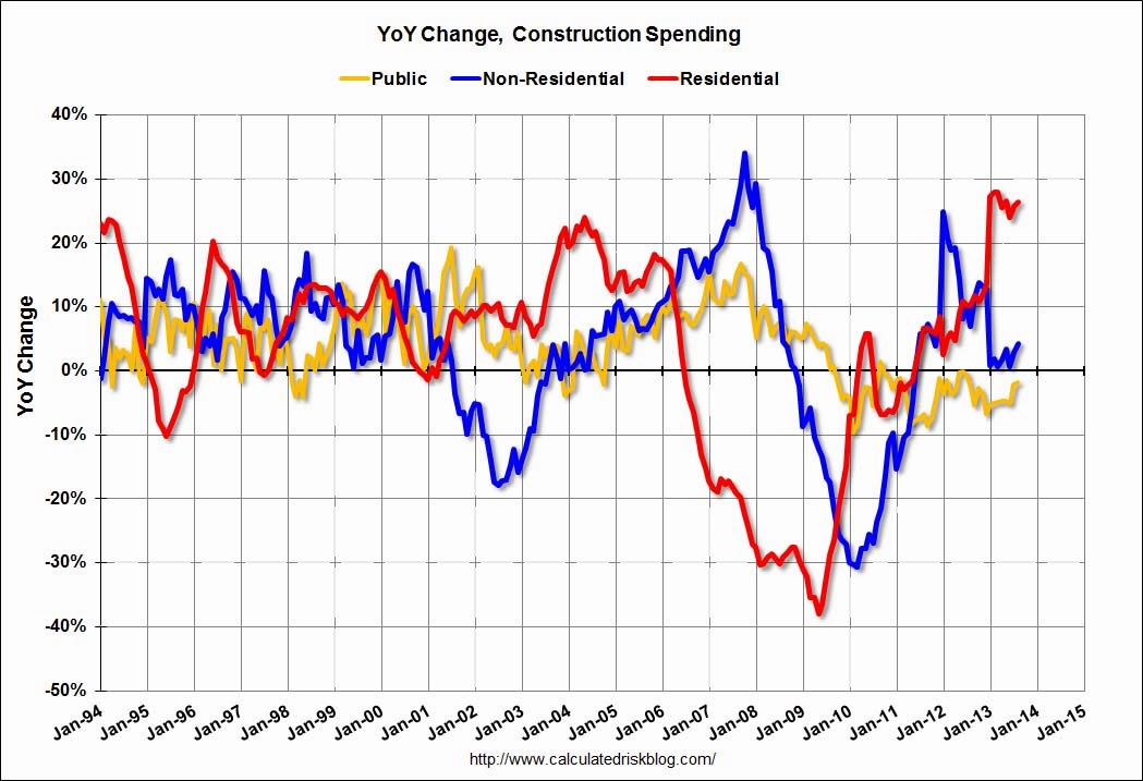 As we indicated above, residential construction was once again the strongest sector of construction spending, and as Bill McBride of Calculated Risk explained, that bodes well for the economy.