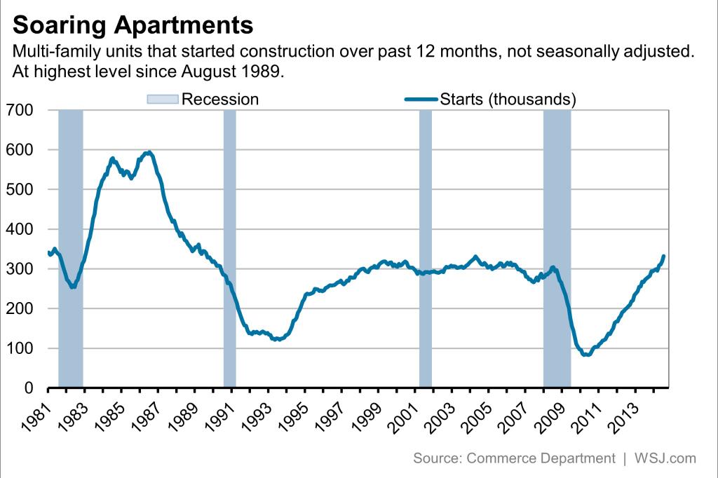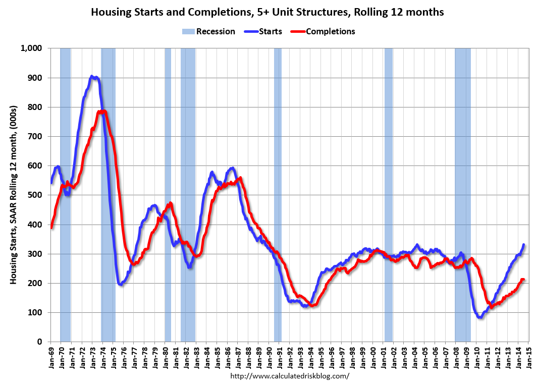 •Multifamily Historic – Not to belabor the point, but it’s worth sharing a few other tidbits on just how rockin’ the multifamily sector is right now. At a seasonally adjusted annual rate of 423,000 starts, multifamily construction is at its highest level since Feb. 2000, and when you take out the seasonal adjustments, multifamily starts are posting their largest increases since 1989. For further perspective, check out this graph from Calculated Risk.