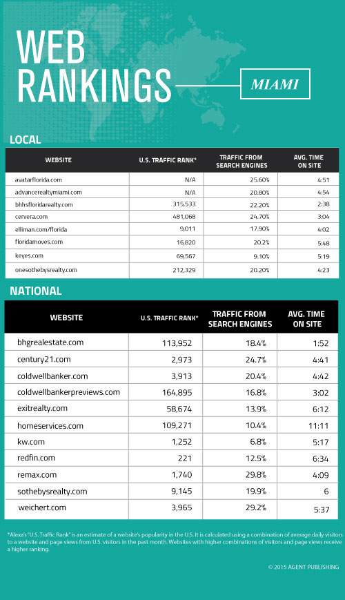 Miami Agent analyzed Web traffic data from Alexa.com, a leading analytics firm, and collected its findings in the infographic below. The numbers were pulled the week of May 18, and the brokerages are ranked in alphabetical order.