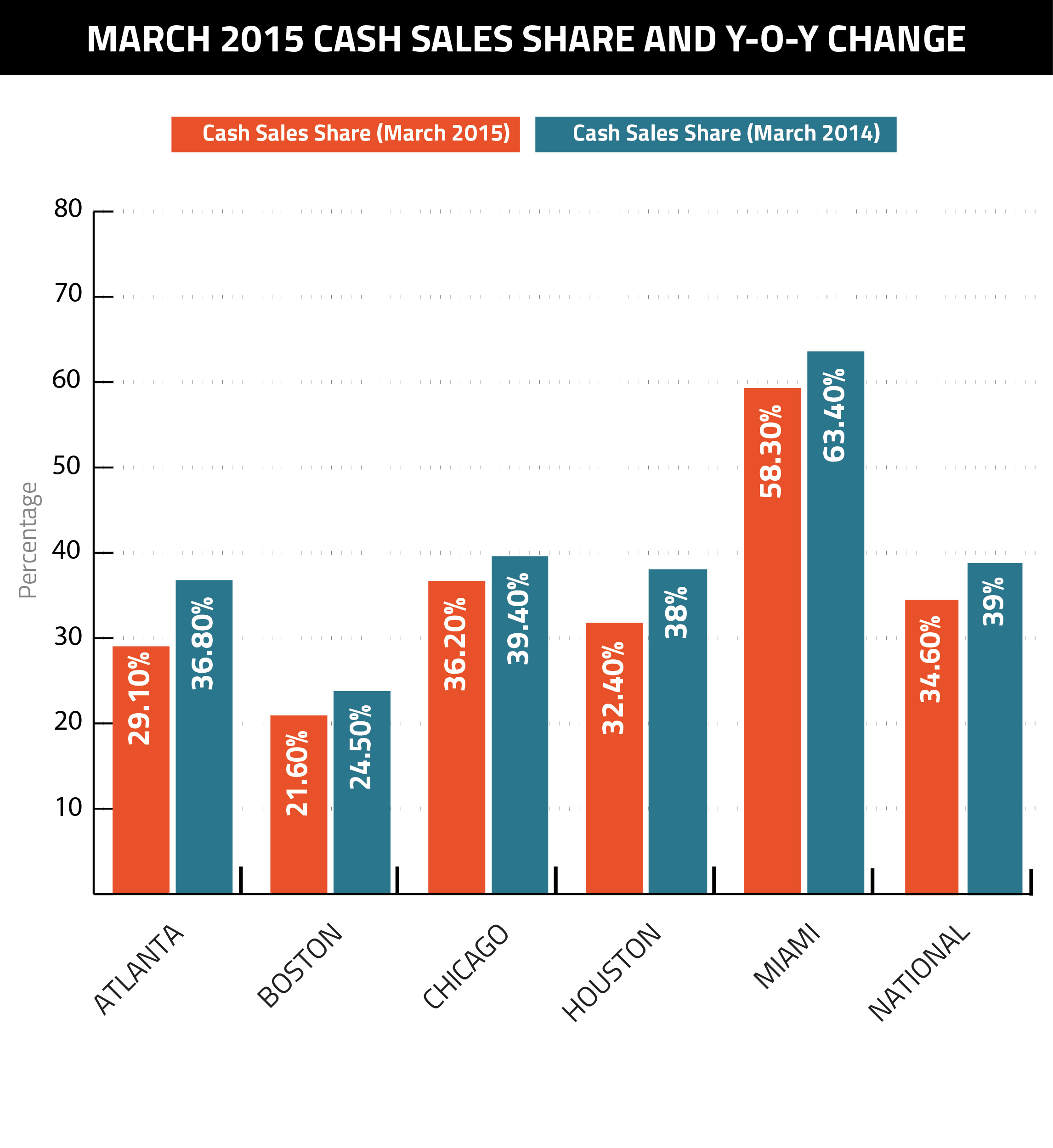 In March, cash sales fell about 5 percentage points year-over-year to 34.6 percent of total home sales nationally. While the drop is a positive note for the industry, it’s not all that surprising. March’s decline is the 27th consecutive month of year-over-year declines, which began Jan. 2013.