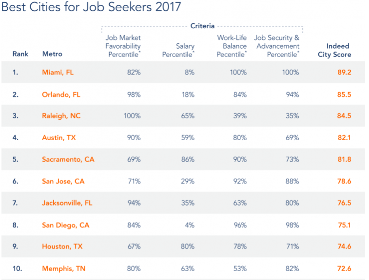 Most of the top cities for job seekers are in the South, and Florida has three cities in the top 10: Miami, Orlando (2), and Jacksonville (7). It’s not just retirees who prefer moving to warmer climates: workers and corporations are joining in too.