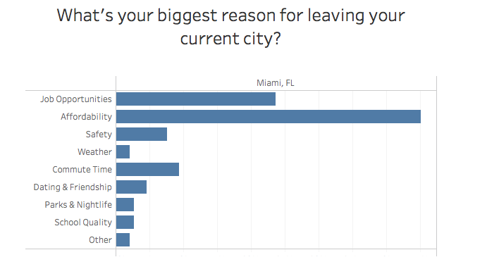 At 45 percent, the most common explanation given for wanting to leave Miami is an overall lack of affordability. As a large coastal economy, the cost of living within the city limits continues to increase, driving current residents straight out of town. Moreover, about 24 percent of people questioned feel that a scarcity of diverse job opportunities is a major factor in the decision to relocate. Among the other reasons provided are both the particularly long morning commute (9 percent) and general safety concerns (8 percent).