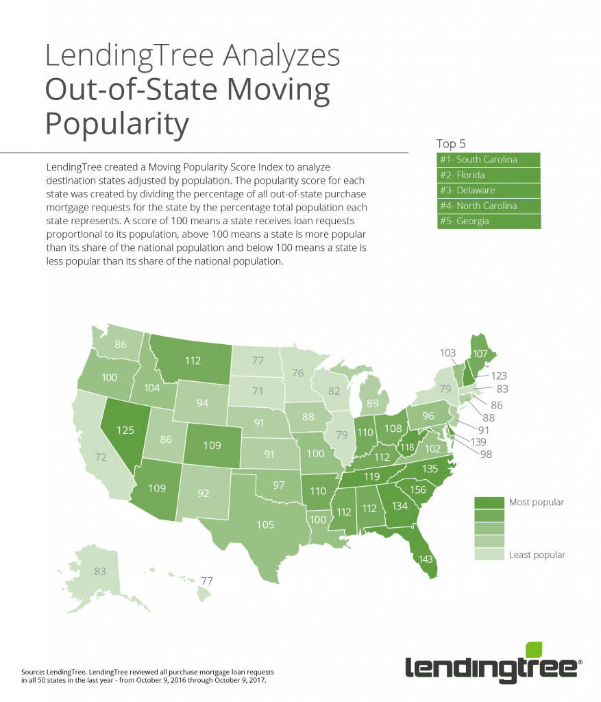 LendingTree reviewed purchase mortgage loan requests for states’ primary residents from October 2016 to October 2017 and measured the percentage of requests from buyers looking to move out of their current state. The website then used that information to create a Moving Popularity Score. The popularity score for each state was created by dividing the percentage of all out-of-state purchase mortgage requests for the state by the percentage total population each state represents. A score of 100 means a state receives loan requests proportional to its population.