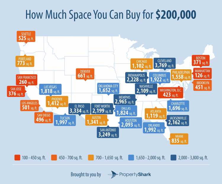 PropertyShark wanted to test the logic and figure out what a homebuyer can get for their money in cities around the United States. To do so, they set a buying price of $200,000 and found out the amount of square feet a buyer could purchase.