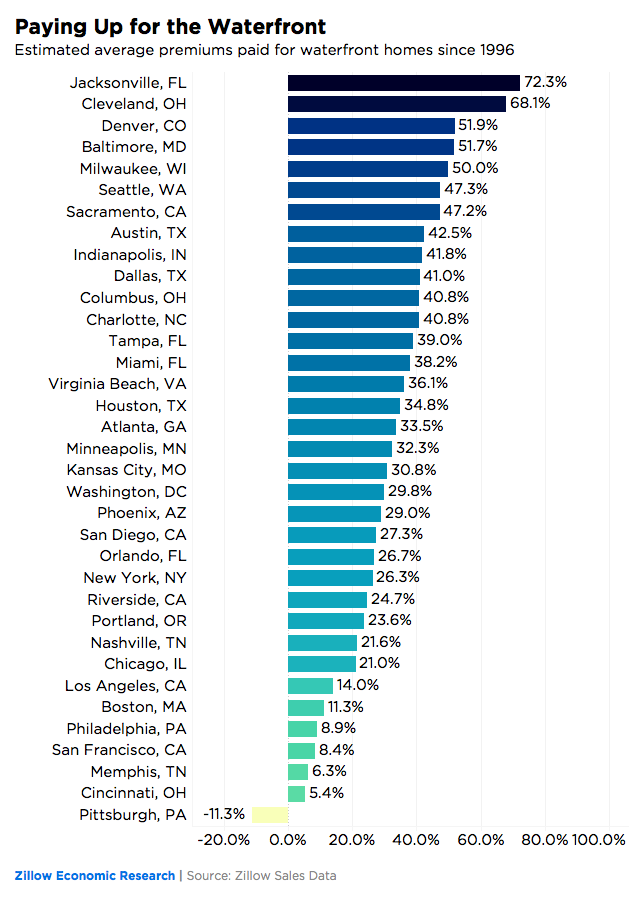 The waterfront premium of any one city is also a function of its geography and the characteristics of its housing market in general. For example, although waterfront homes in Denver, Sacramento and Austin have fetched some of the largest premiums since 1996, Zillow noted that these cities just have a very small amount of water-adjacent developed land available. In already expensive markets like Los Angeles and San Francisco, waterfront premiums are relatively small, but the sheer cost of a typical home in these cities means buyers aren’t exactly getting a bargain.