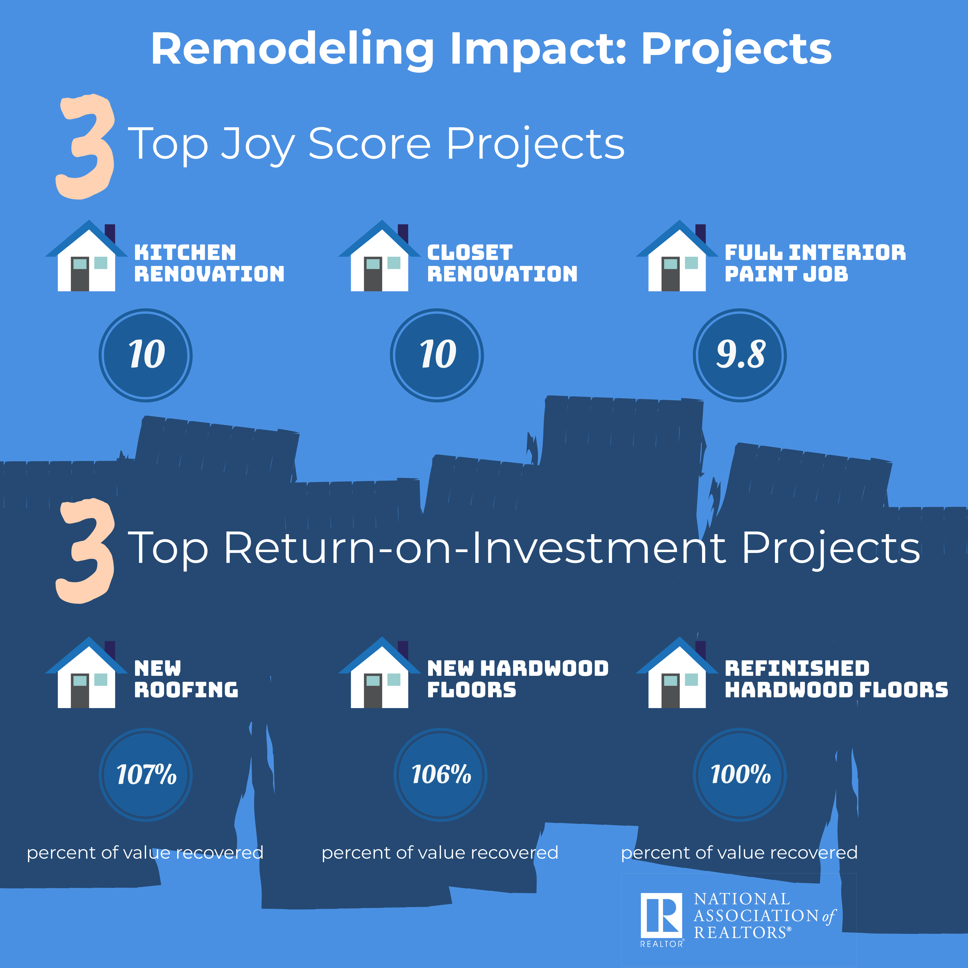 “Realtors and homeowners alike recognize the value of taking on a major home remodeling project,” NAR President John Smaby, a second-generation Realtor from Edina, Minnesota, and broker at Edina Realty, said in a press release. “While these tasks can be time consuming and costly, the projects are well worth the temporary inconveniences, as this report shows, and the final products ultimately reward us, with feelings of accomplishment, satisfaction and higher homes values.”