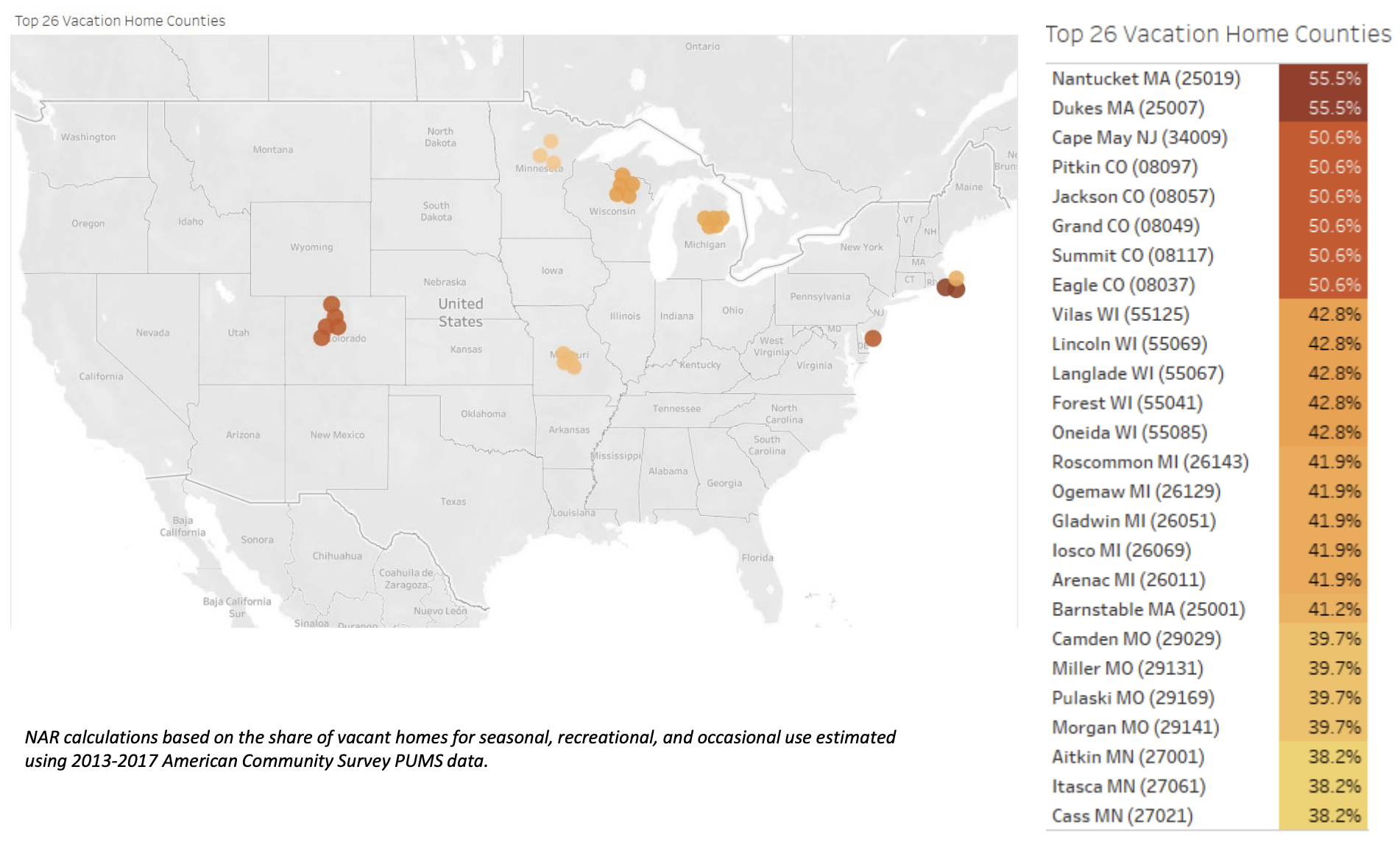 “Some people may visualize the common popular vacation destinations in the U.S. when considering a vacation home, such as counties in Florida or California,” Lawrence Yun, NAR’s chief economist, said in the report. “And although those locations have their share of vacation properties, we see that some homeowners prefer some of the other counties, including those in Massachusetts and New Jersey. These areas are often known for harsh weather conditions but are popular nonetheless.”