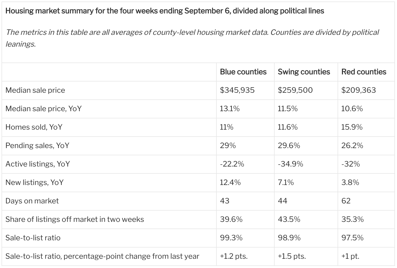 The median price of a home in blue counties rose 13.1% year over year to $346,000 for the month ending Sept. 6, while in swing counties it was up 11.5% to $259,500 and in red counties 10.6% to $209,000.
