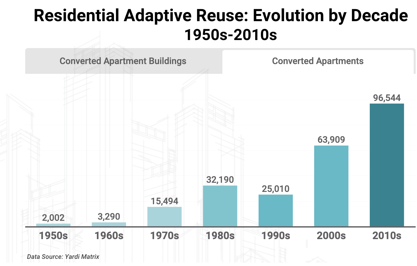 Commercial buildings are being converted faster than ever over the last decade with approximately 778 old buildings made into apartments since the 2010’s, according to a blog post from RentCafe.