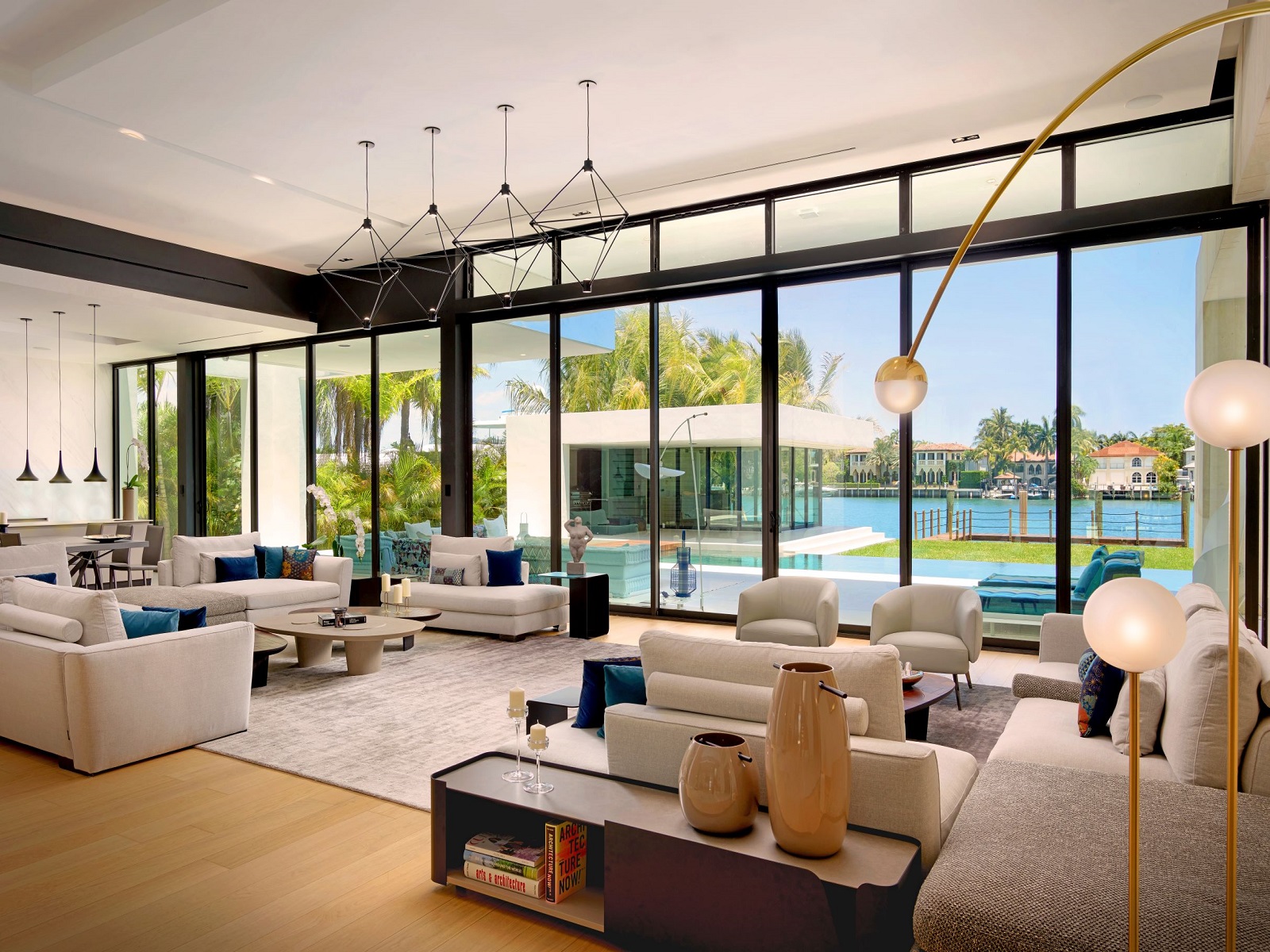Outside, the property features a pool, jacuzzi, sauna, kitchen, covered dining area, separate cabana room with full bathroom and dockage for yachts up to 100 feet.