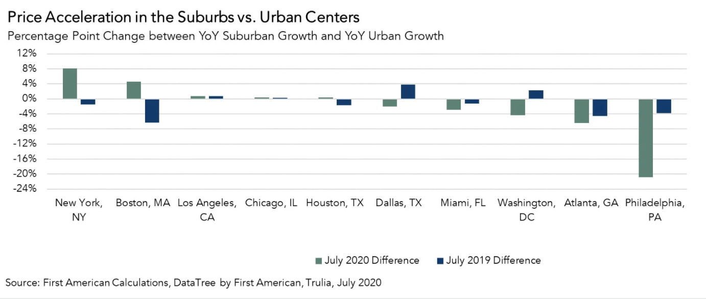 “The average gap between suburban versus urban house price growth favored suburban zip codes by 1 percentage point in the five months preceding the pandemic,” First American Deputy Chief Economist Odeta Kushi said in a press release. “But, as the pandemic took hold, the gap intensified, favoring suburban zip codes by 7 percentage points from March through July.”