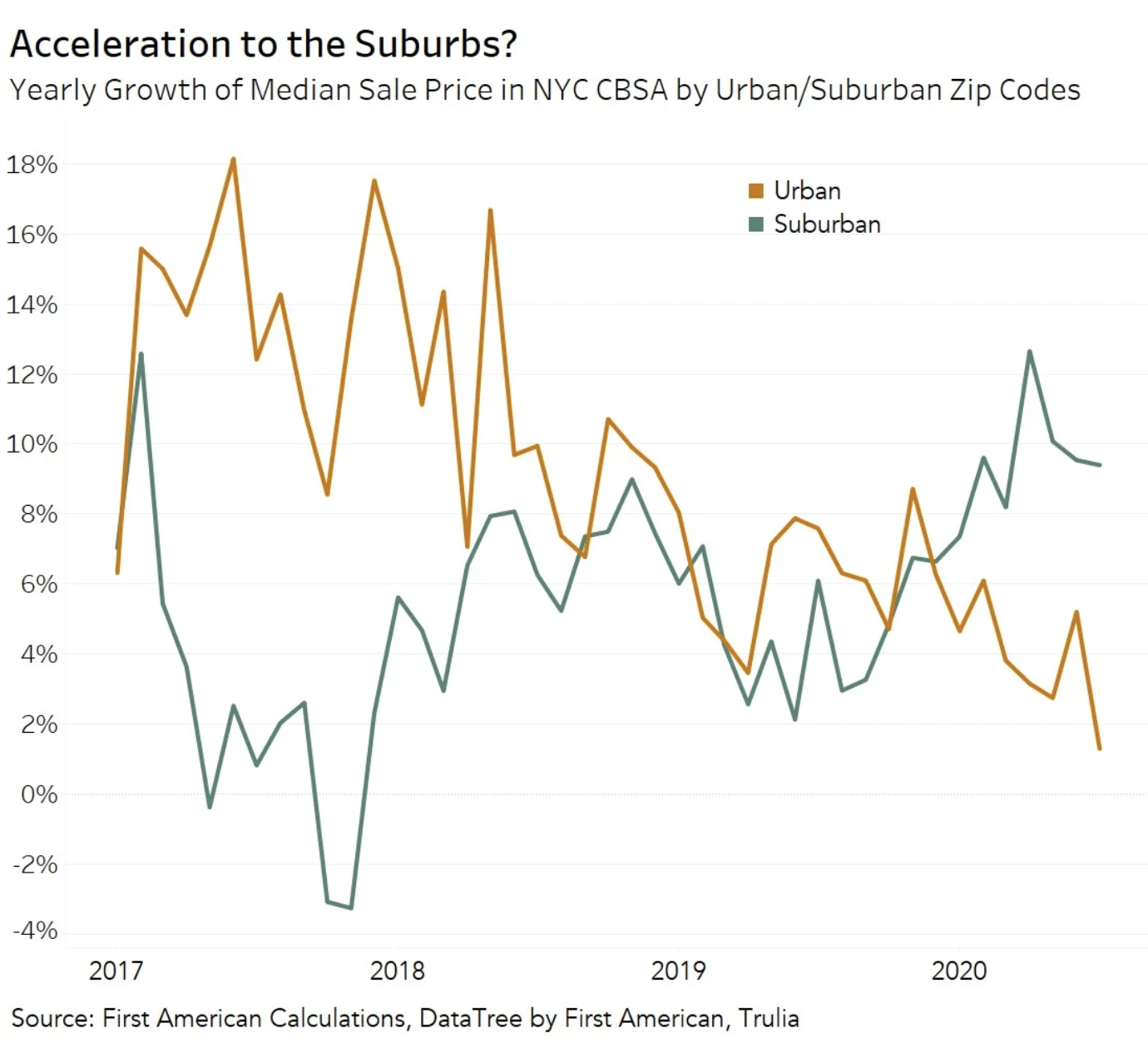 The analysis looked at urban and suburban zip codes of the 10 most populous U.S. cities and found that markets where suburban home sales outpaced their urban counterparts, that difference was an average 1.8 percentage points. That jumped to 2.8 percentage points in 2020.
