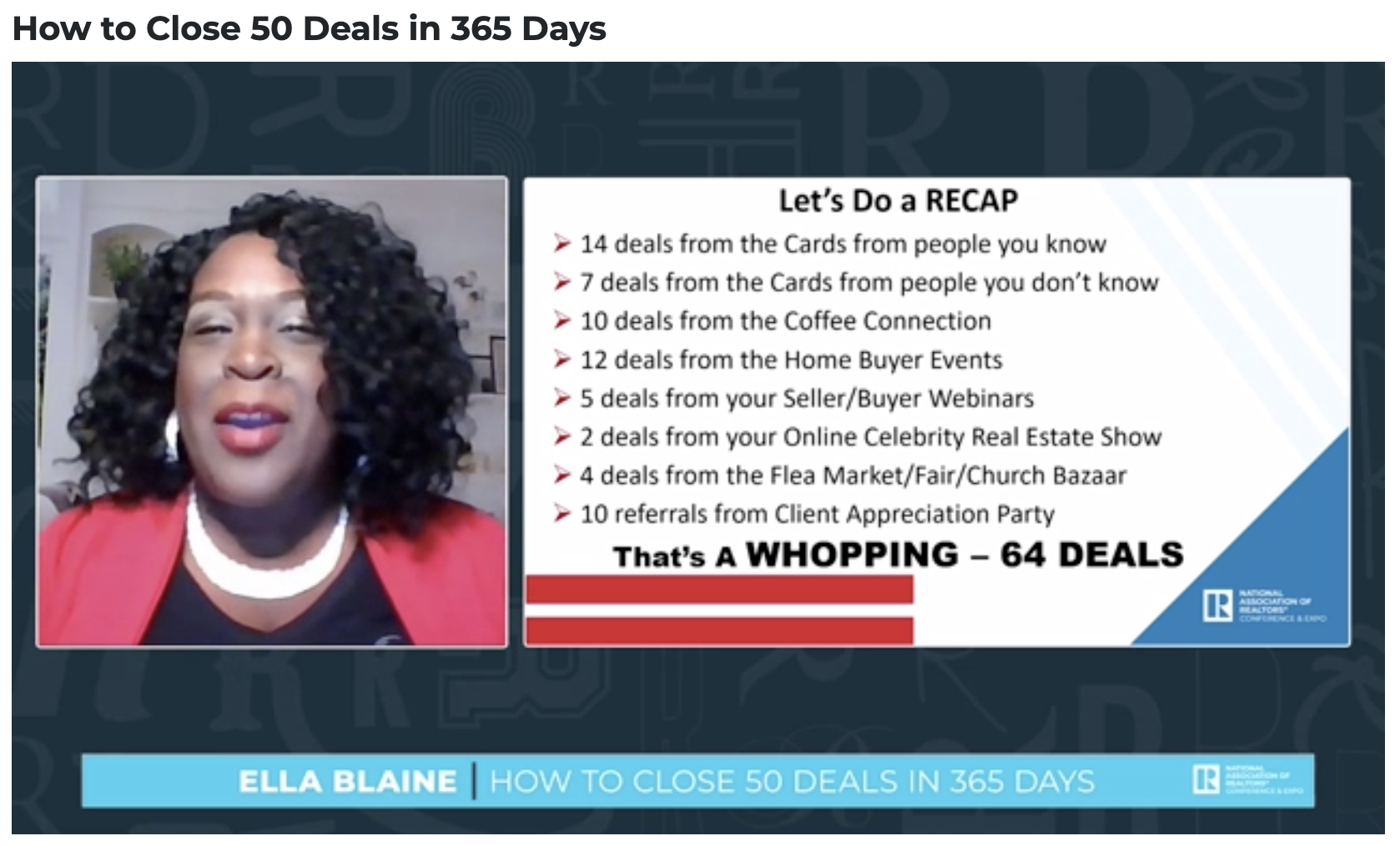 Coach Ella Blaine, who is a real estate coach and founder of the Real Estate Ladies Rock Facebook group, offered tips on how to achieve the goal of closing 50 deals annually and go even further in her webinar at the 2020 Realtors Conference and Expo.