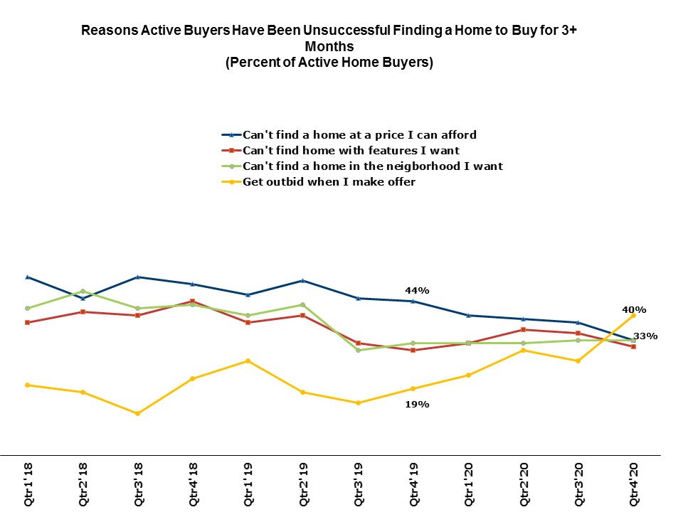 The National Association of Homebuilders reports that 69% homebuyers actively searching in the fourth quarter of 2020 spent three more than months with no success.