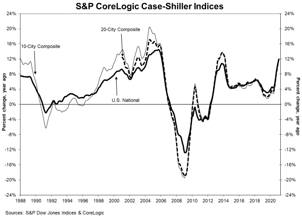 The S&P CoreLogic Case-Shiller U.S. National Home Price NSA Index shows a 12% year-over-year price gain in February.