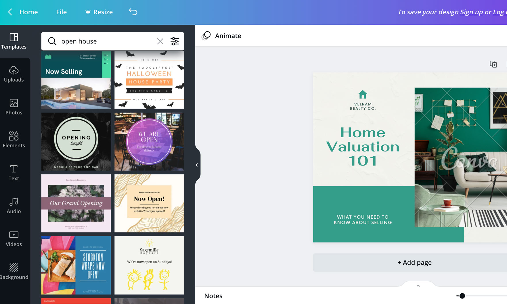 OK, so what if you have never defined your brand? Then this is a great place to get started. Scroll through their templates and fonts, and see which ones are “you” and the brand/image that you want to convey to your audience. It’s a lot of fun to hunt around and you will know it when you see it. It will feel “right” — just like a homebuyer knows when they’ve found the right home. Once you have found the one that fits you best, then you need to stick to that theme consistently so that your audience will be able to tell immediately that it’s you — THAT is how you build your brand and, most importantly, a dependable following. You can carry that theme into your listing presentations (and Canva can assist you with that, too), print brochures, e-campaigns and all of your print/digital marketing. Once clients see this consistency throughout, they will know they are working with a true professional and will want to hire you to sell their home.