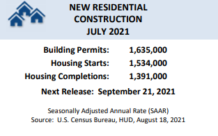 The seasonally adjusted annual rate for privately owned housing units authorized by building permits was at 1,635,000 in July, up 2.6% from June’s revised rate and up 6% from July 2020.