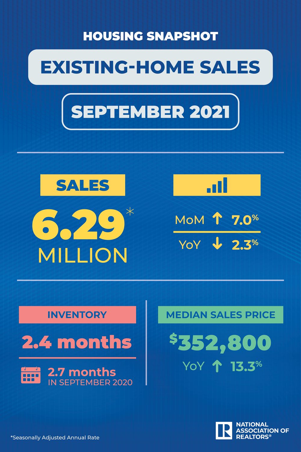 Total existing-home sales, which are completed transactions including single-family homes, townhomes, condominiums and co-ops, jumped 7% from August to a seasonally adjusted annual rate of 6.29 million in September. Year over year, however, sales slid 2.3% from 6.44 million transactions in September 2020.