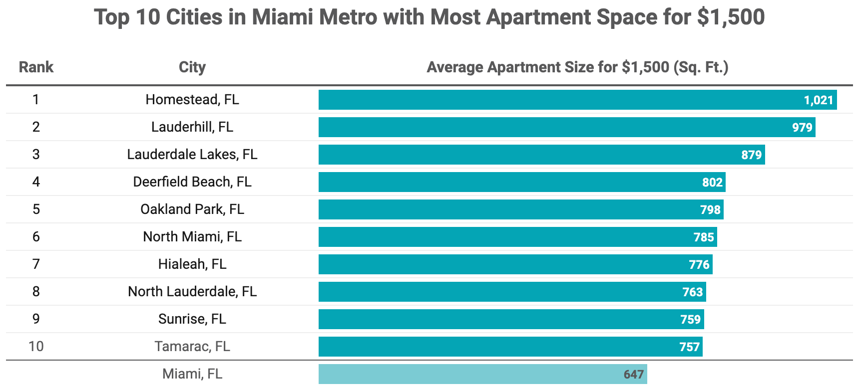Other areas within the Miami metro also offer less expensive alternatives. In the Miami-Dade suburb of Homestead, $,1500 will get you 1,021 square feet of space. And in the Broward suburbs of Lauderhill and Lauderdale Lakes, the same budget can afford 979- and 879-square-foot apartments, respectively.