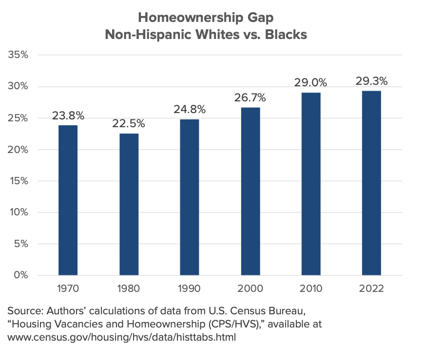 Just 45.3% of Black households owned their own homes in 2022, according to the National Association of Real Estate Brokers (NAREB), compared to 74.6% of white households. That 29-point percentage gap is larger than the 27-point gap in 1960, before the Fair Housing Act was passed.