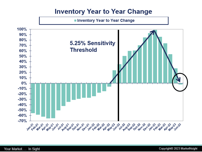 After going negative during the pandemic housing boom, inventory swung to positive territory in summer 2022 as interest rates crossed the 5.25% sensitivity threshold, MarketNsight said. Inventory then rose quickly, peaking in January with double the supply of a year before. However, inventory reversed course just as quickly, turning negative in June.