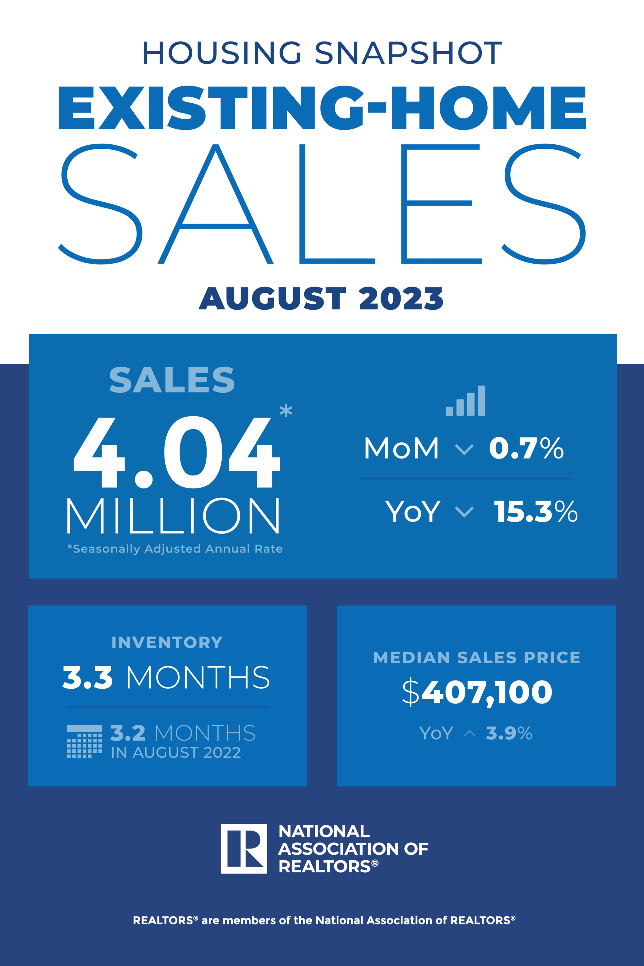 Existing-home sales slid 0.7% from July to a seasonally adjusted annual rate of 4.04 million. Year-over-year, sales were down 15.3% from 4.77 million in August 2022.