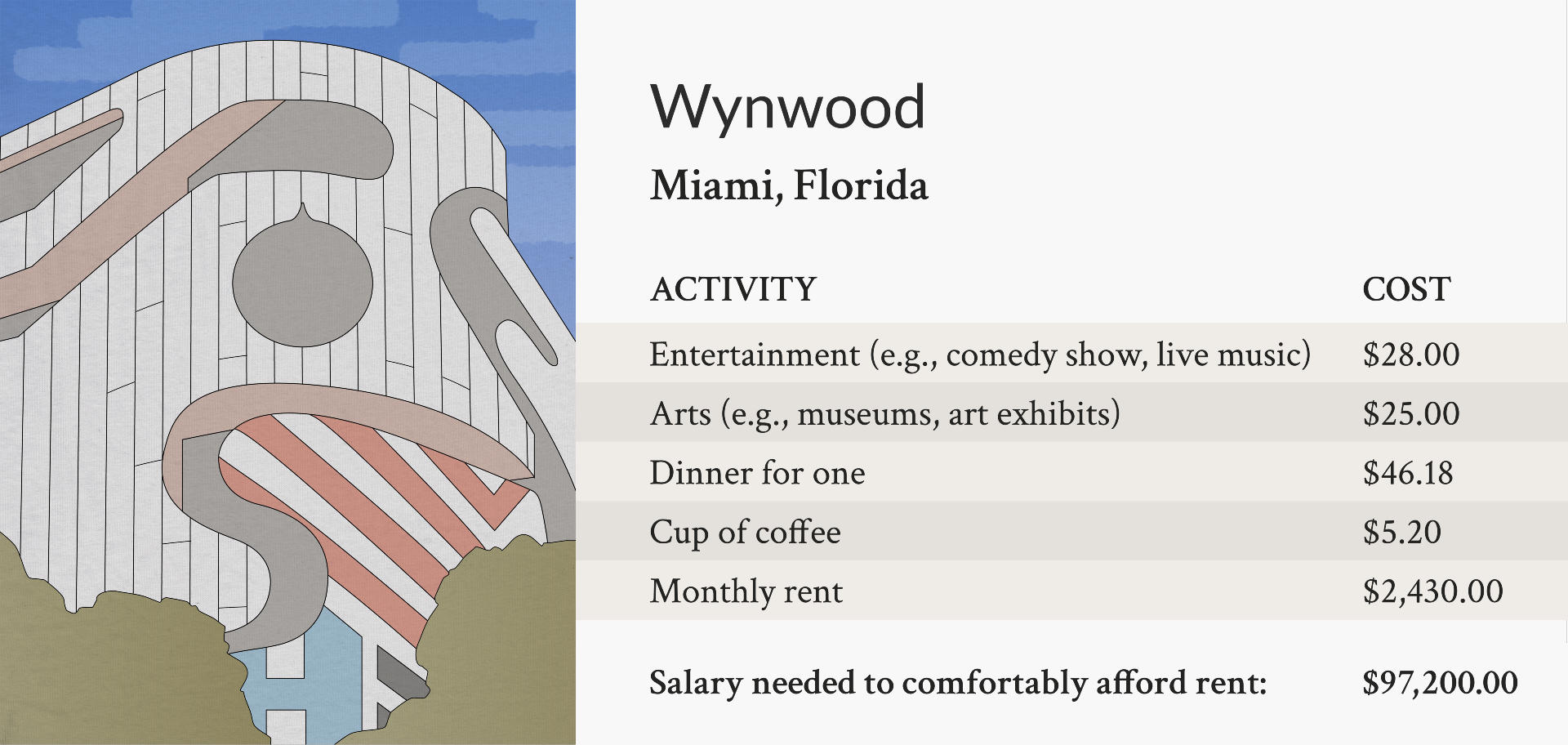 The typical monthly rent in Wynwood costs $2,430, meaning renters need a salary of at least $97,200 to rent comfortably. However, the median income in Miami is only $41,287 annually.