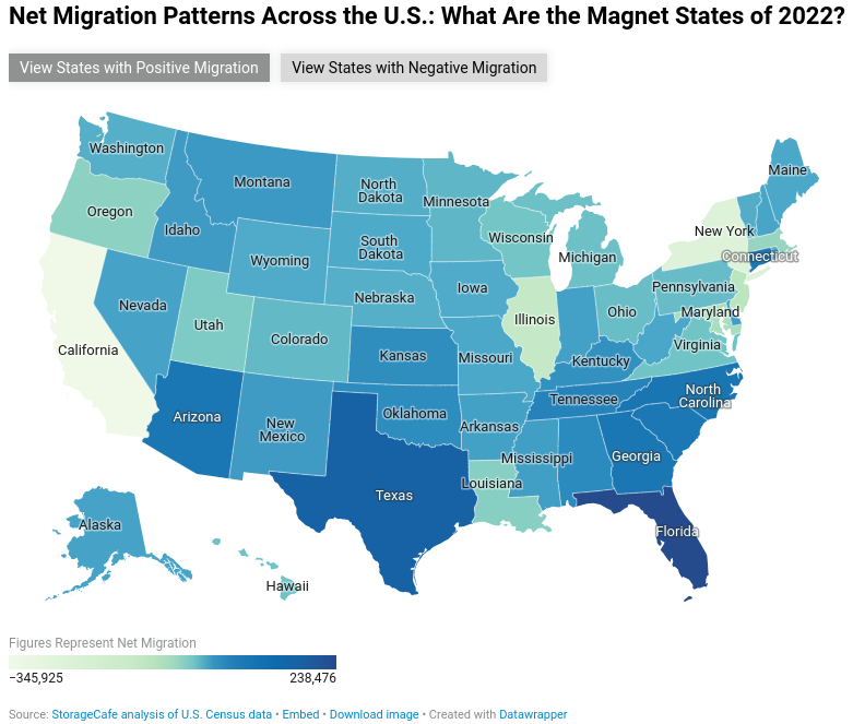 After Florida, Texas and North Carolina rounded out the top three states for net migration, followed by Arizona and Georgia, giving the Sun Belt a clean sweep of the top five states. On the flip side, the states with the greatest out-migration in 2022 were California, New York, Illinois, New Jersey and Maryland, according to StorageCafe.