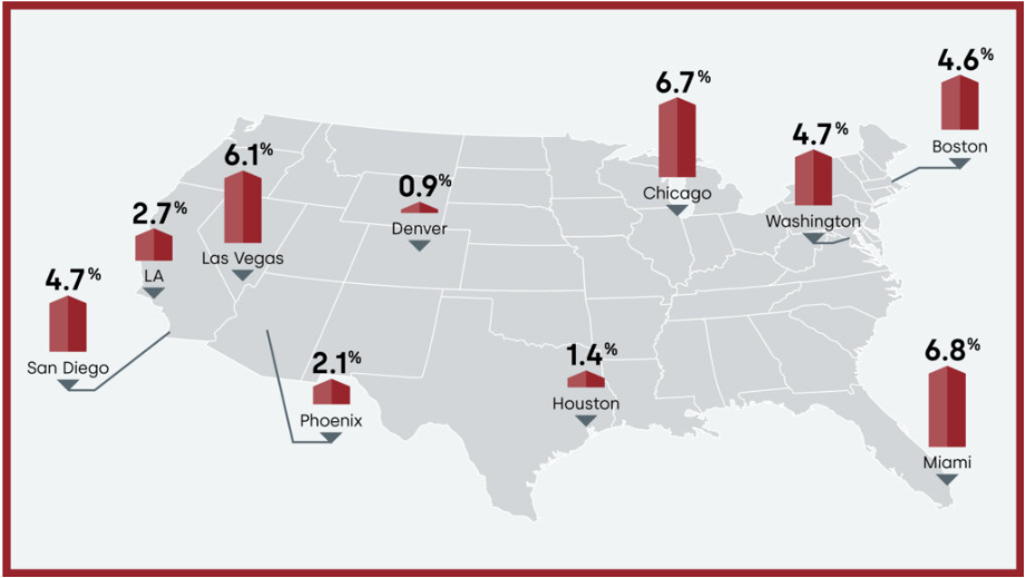 Geographically, Miami once again posted the highest annual increase among the country’s 20 largest metro areas, at 6.8%, followed by Chicago at 6.7% and Las Vegas at 6.1%.