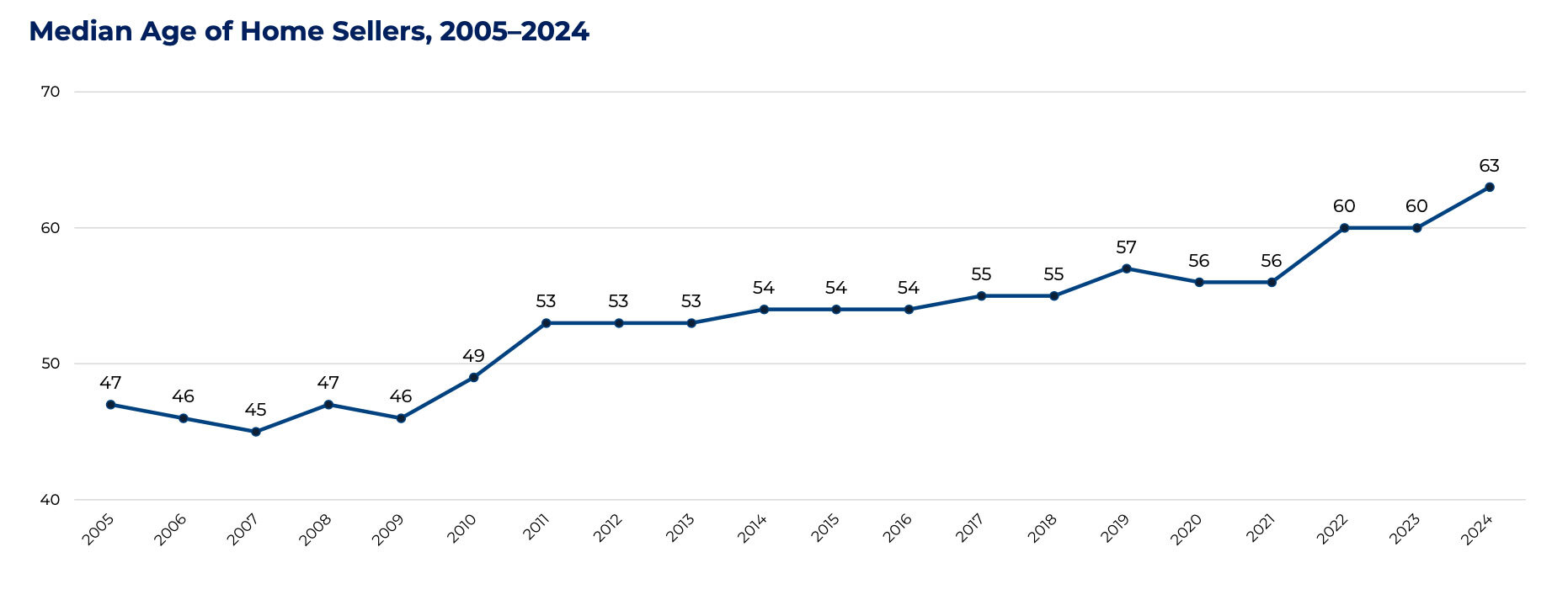 Meanwhile, the median age of homesellers reached 63 years, the highest ever recorded. This marks a three-year increase from both 2023 and 2022. The overall age of homesellers rose sharply after 2008, but the last few years mark a distinct increase. For context, in 2005, the typical home seller was 47; in 2020, 56.