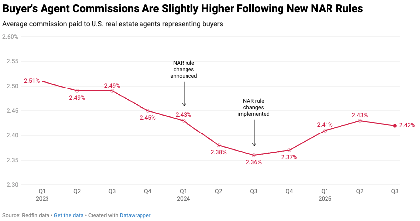 The increase brought the average commission from a low of 2.36% in Q3 2024 to 2.42% last quarter. That level was down one basis point from 2.43% in the preceding quarter. The low of 2.36% occurred when NAR implemented the change in August 2024.