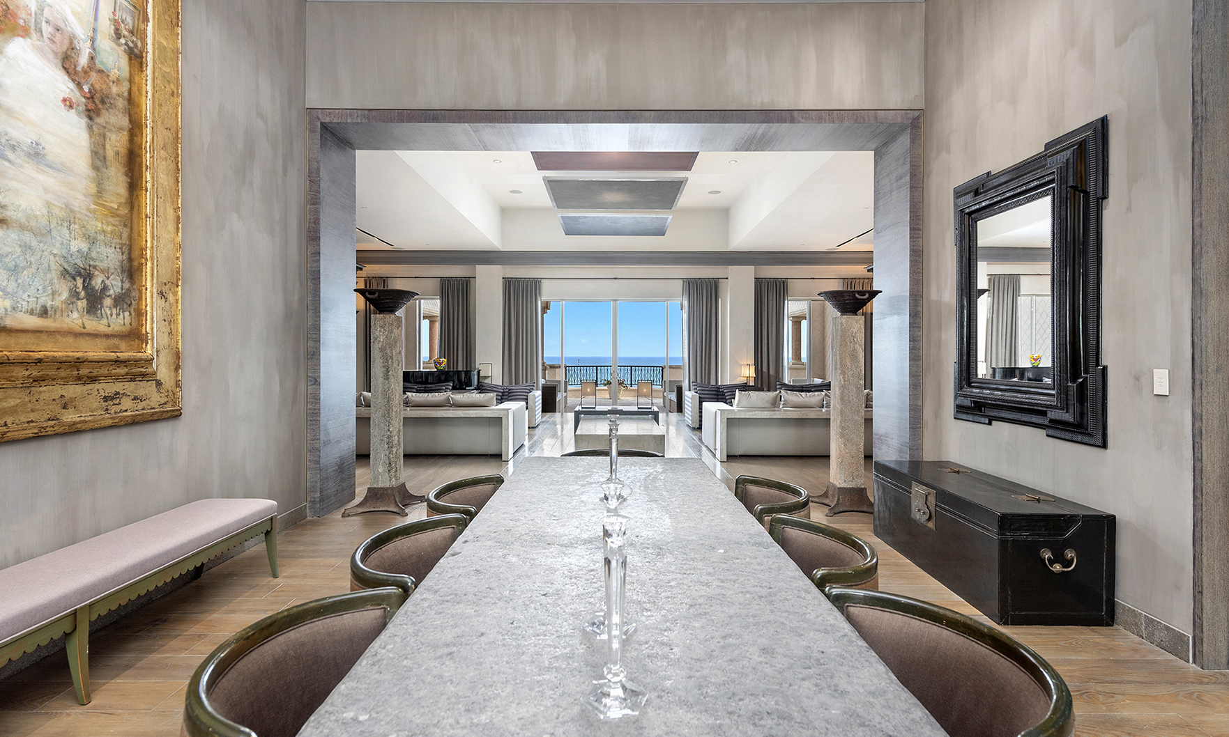 The dramatic grand entrance with 15-foot ceilings provides a framed view of the ocean.