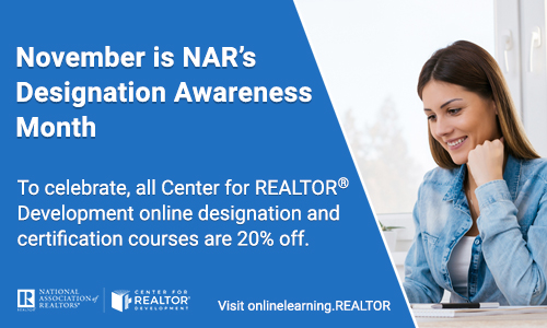 The following information is provided by the NAR’s Center for REALTOR® Development. Each year in November, the National Association of REALTORS®—in partnership with its Institutes, Societies, and Councils—encourages members to focus on their professional education and seek additional credentials.