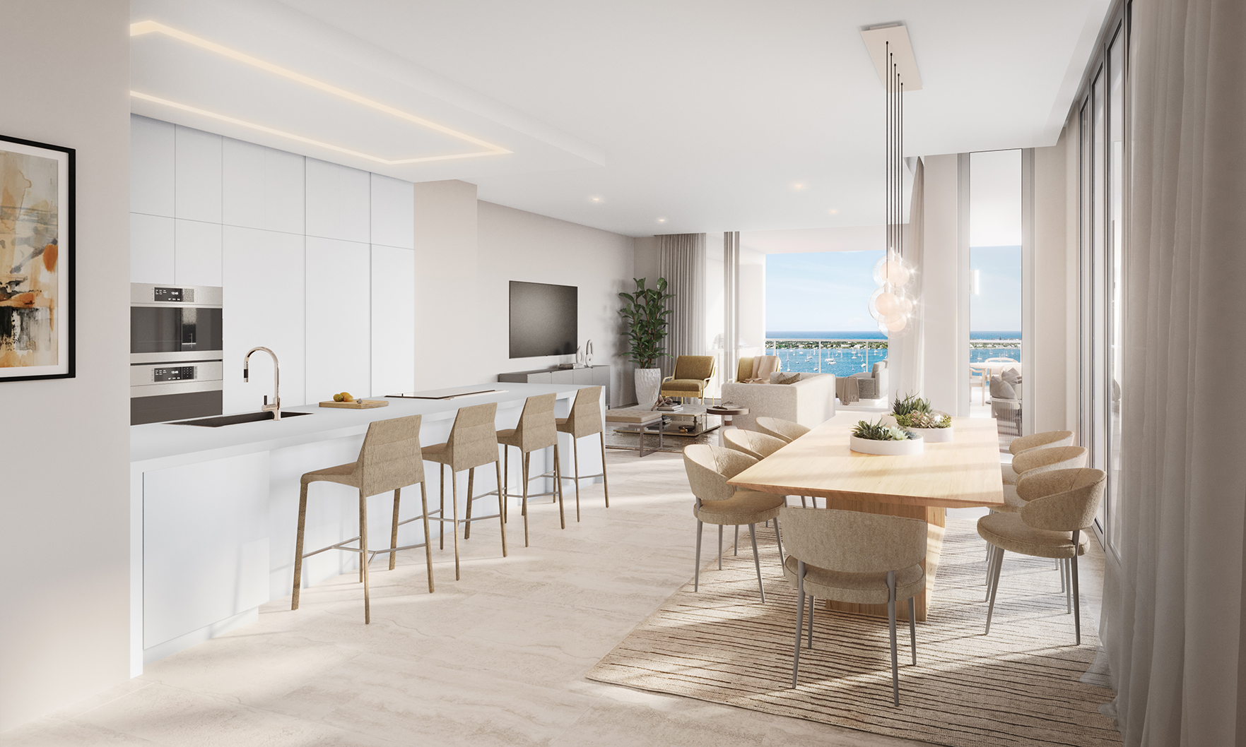 The coveted Lower Penthouse Collection consists of only six trophy residences, each offering 180-degree water views, expansive layouts, and 11-foot ceilings that emphasize light, scale and sophistication. LPH 2002 spans 2,755 square feet with three bedrooms, four bathrooms and a den, providing a thoughtful balance of privacy, openness and flexible space for work, guests or entertaining. One of the home’s most impressive features is its 1,500-square-foot, glass-framed terrace with a summer kitchen and panoramic views of the Intracoastal, Palm Beach Island and the Atlantic Ocean.