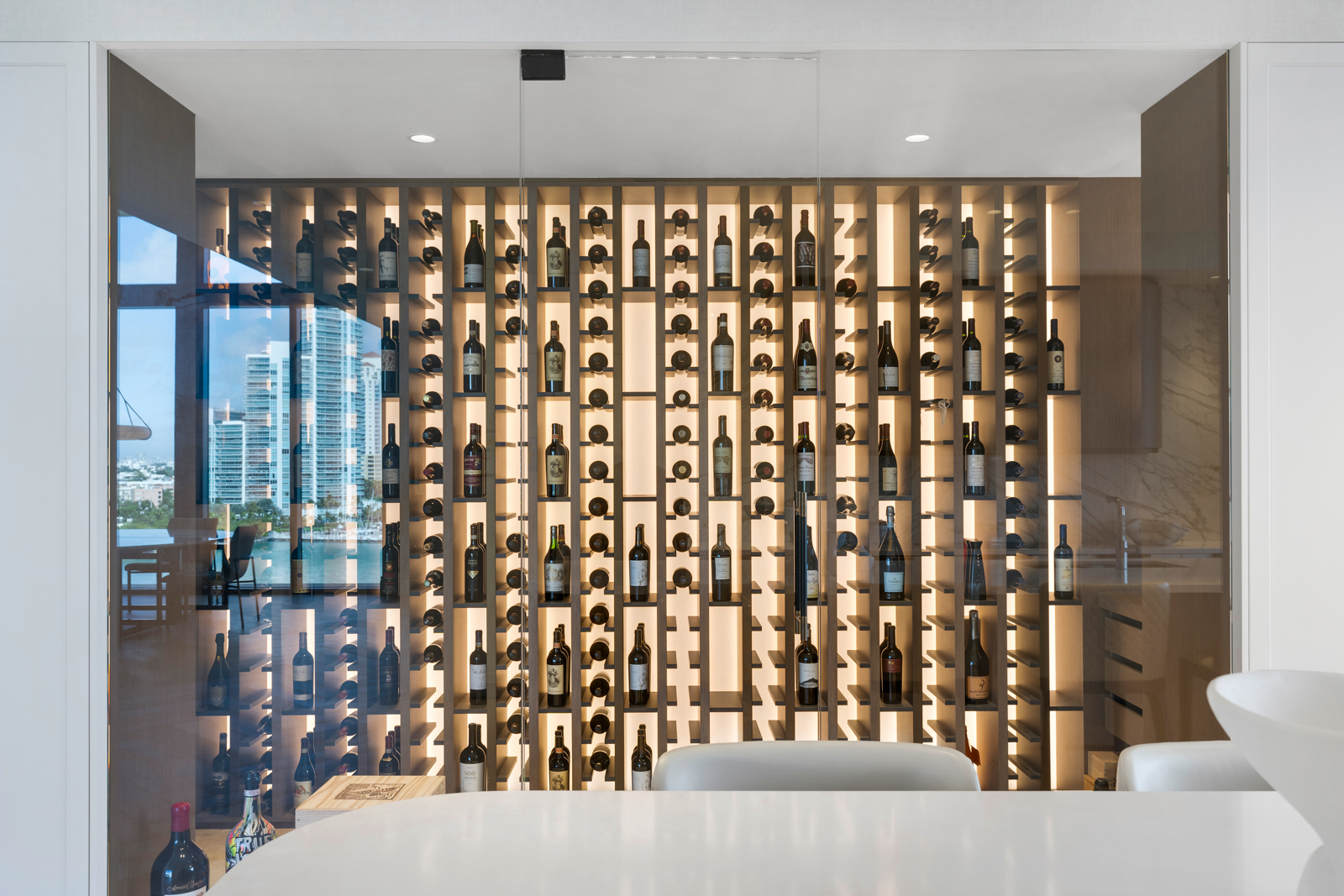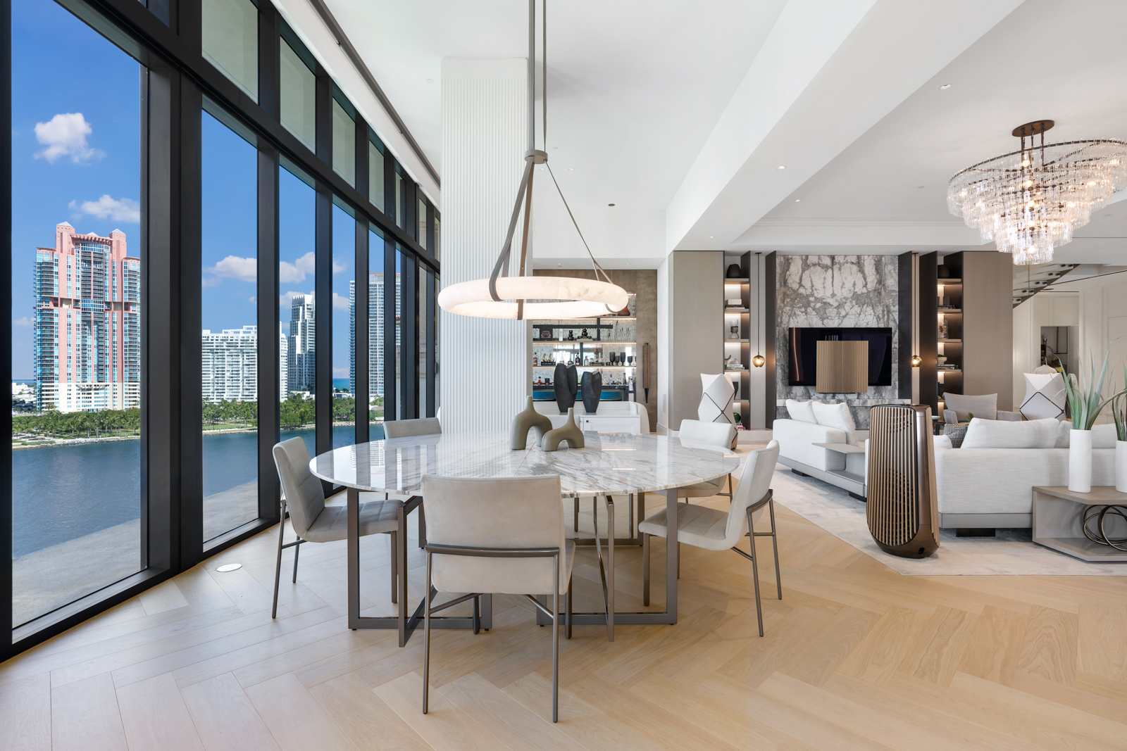 Other features include a media room, wine wall, Bang & Olufsen sound system, smart-home technology controlling retractable glass doors and a terrace firepit and hot tub. The rooftop has a private pool, summer kitchen and views of Biscayne Bay and the Miami skyline.