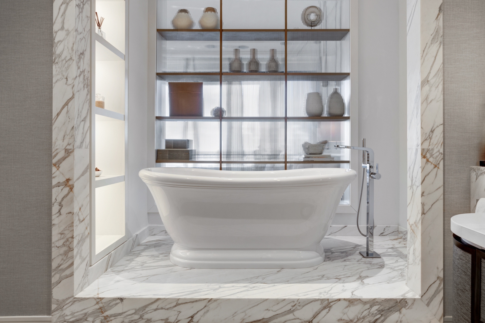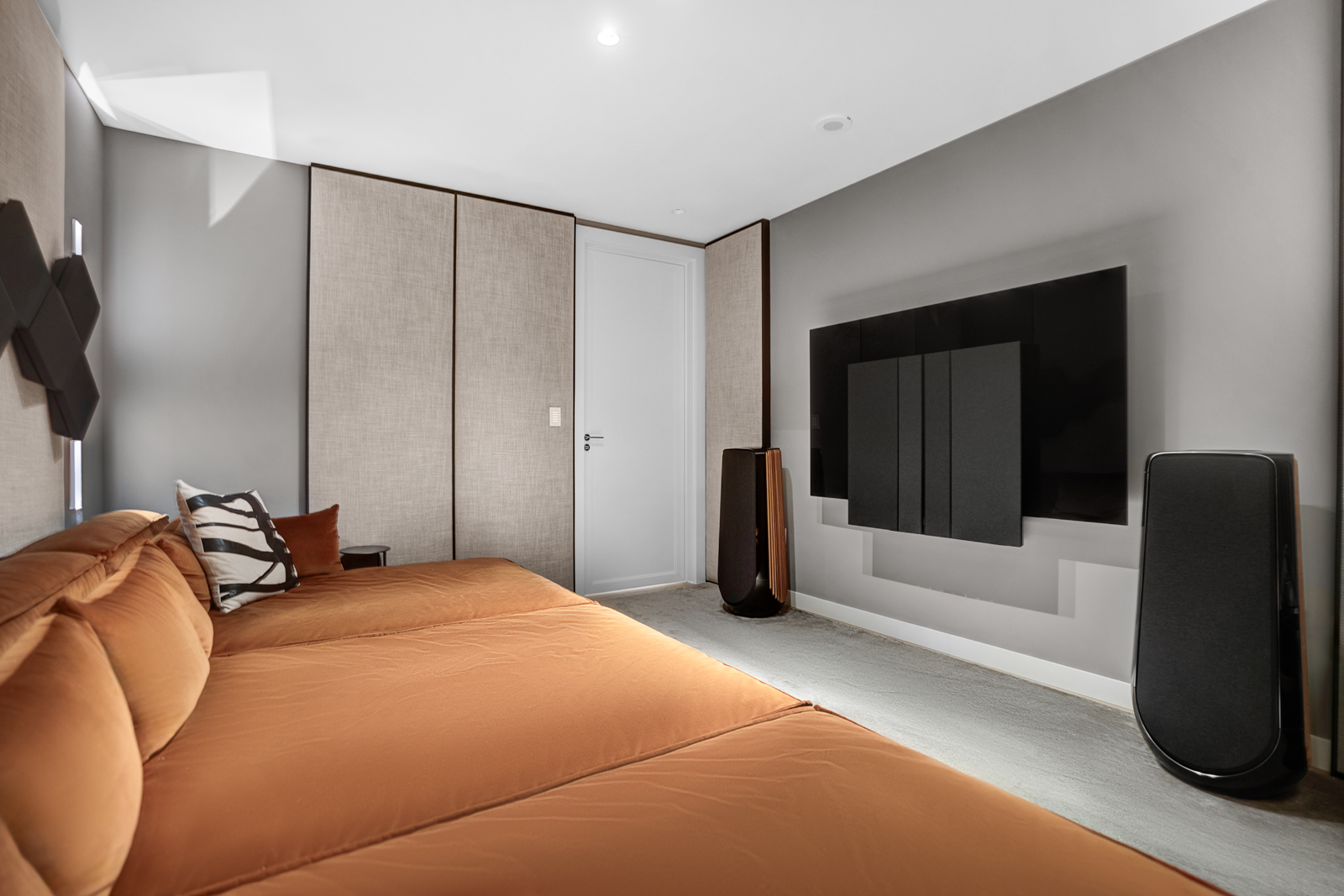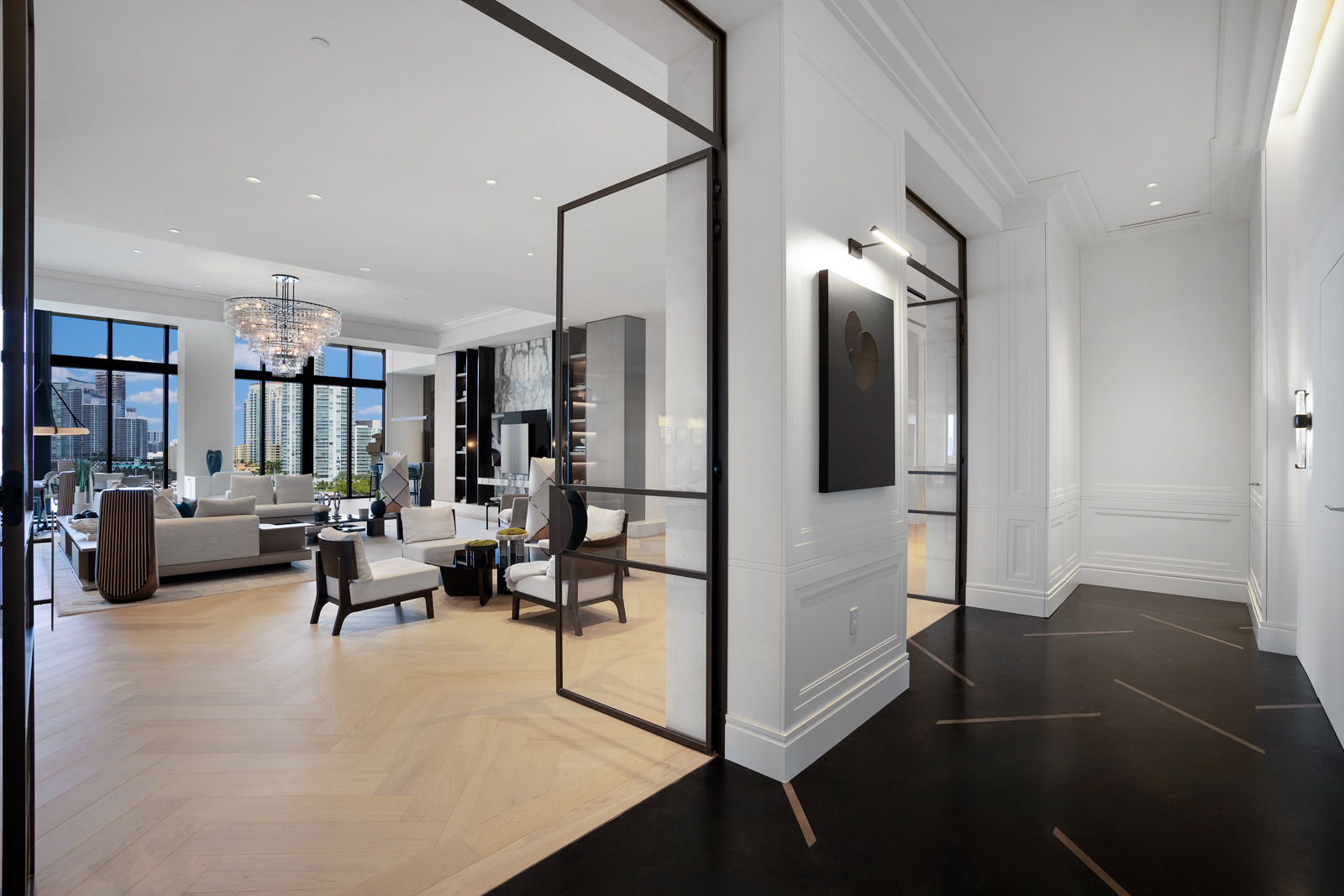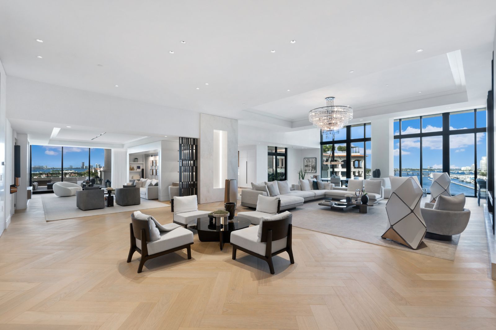 The interior offers a grand salon with double-height ceilings, custom marble media walls and herringbone white-oak floors. A chef’s kitchen includes Gaggenau appliances and an art deco island and hood.