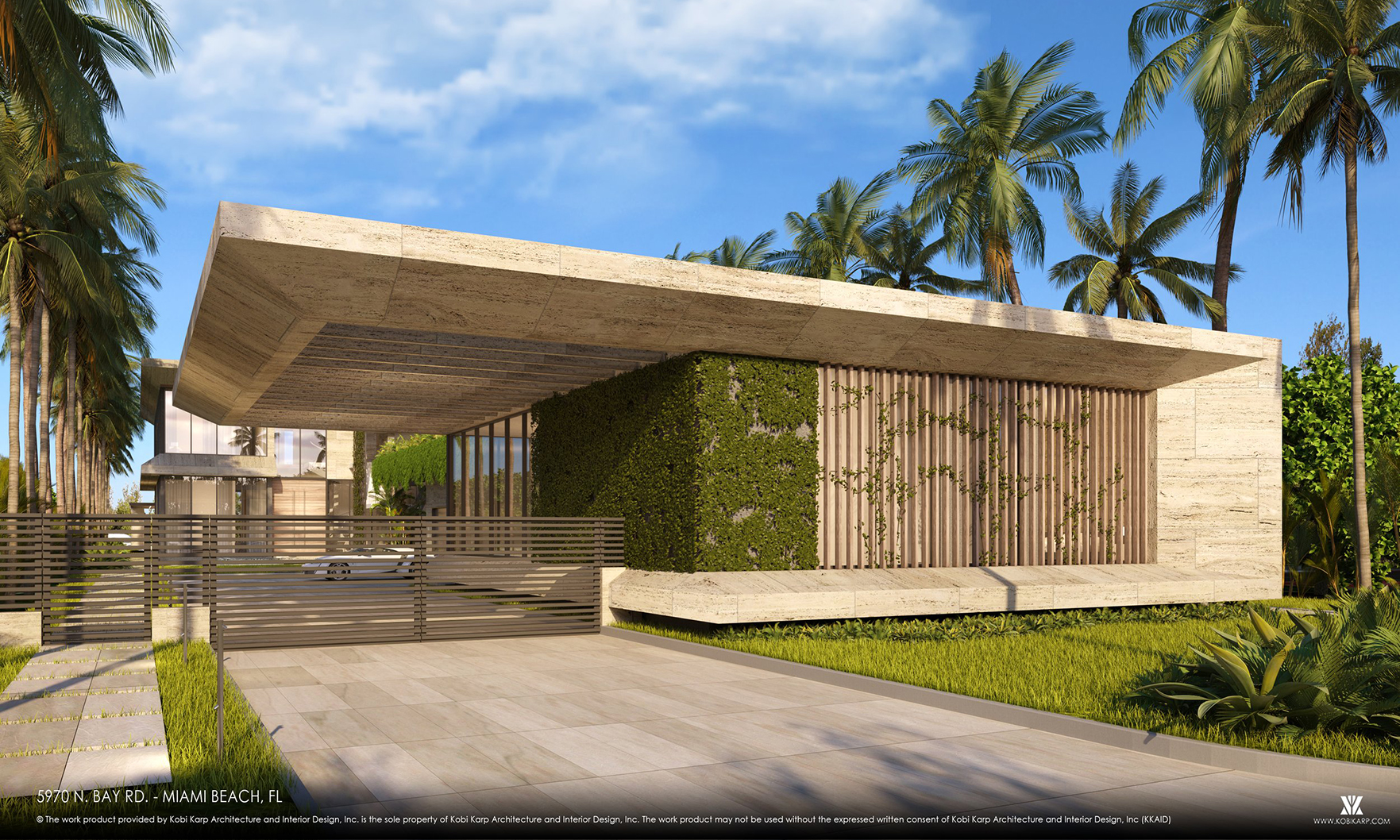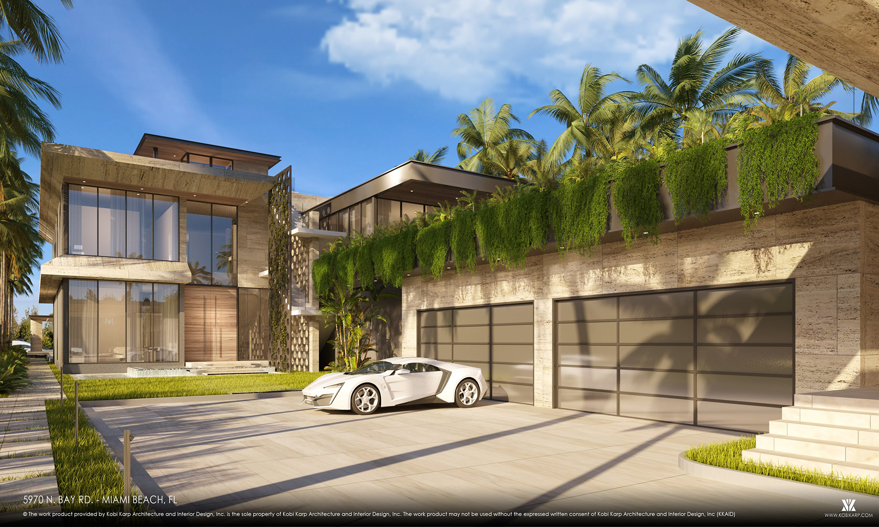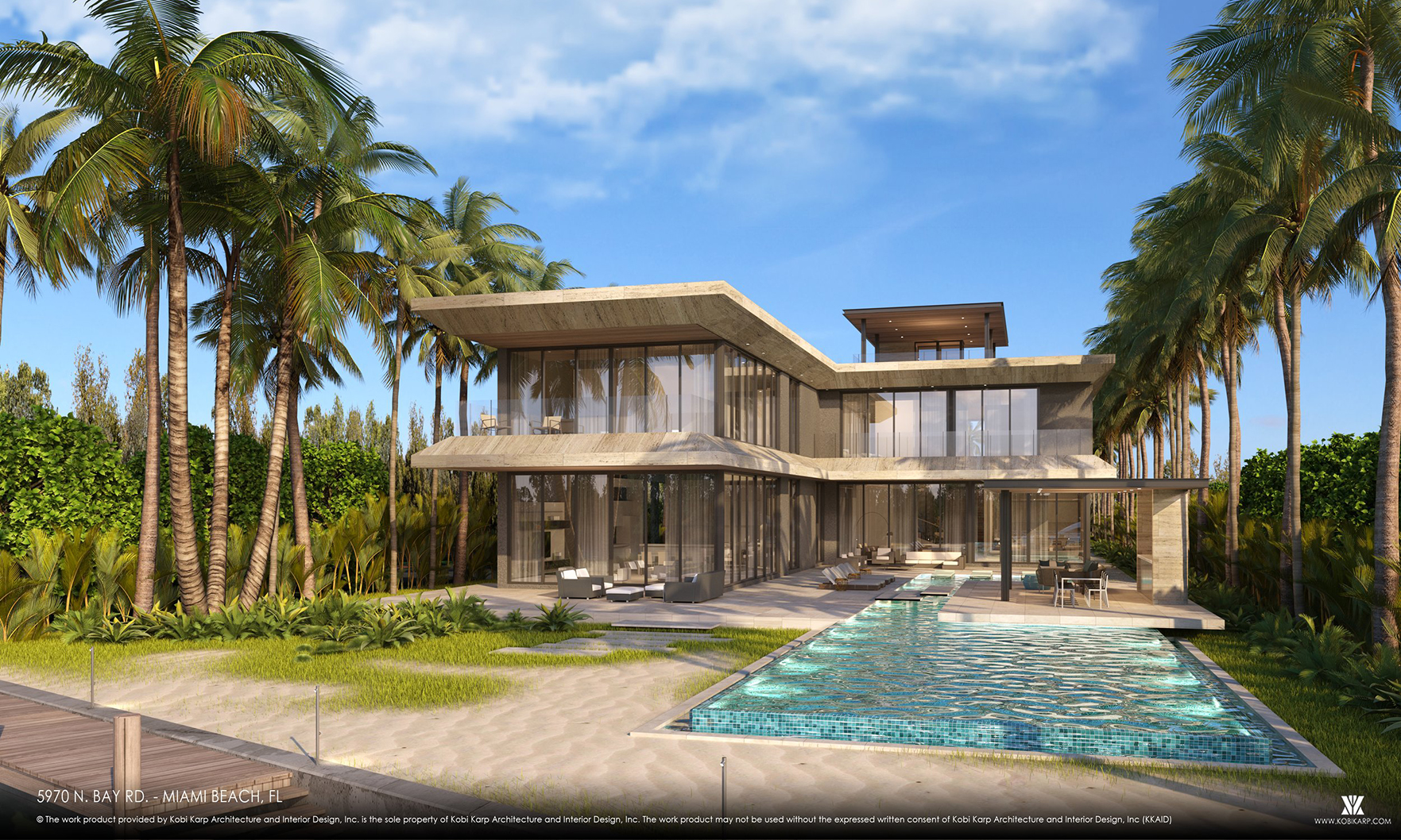 The property, which sits on a 30,800-square-foot lot at 5970 North Bay Road, offers 100 feet of water frontage. Outdoor amenities include two pools, one facing the water and another facing east on the second floor.